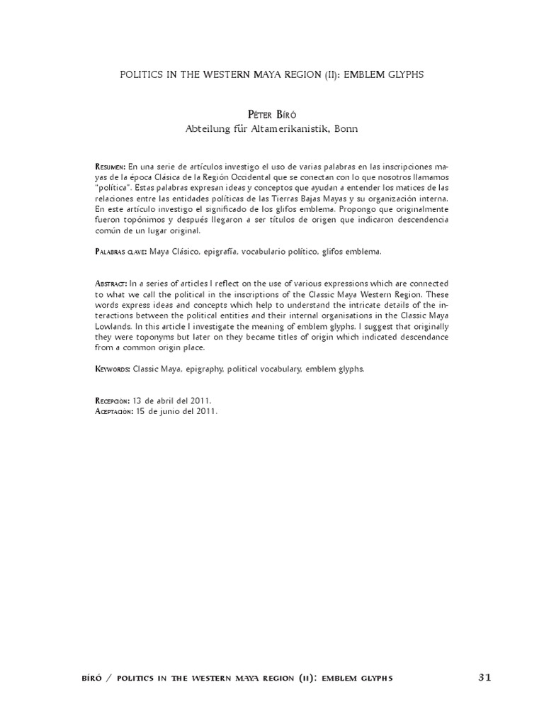 KEYWORDS: Classic Maya, epigraphy, political vocabulary, emblem glyphs.