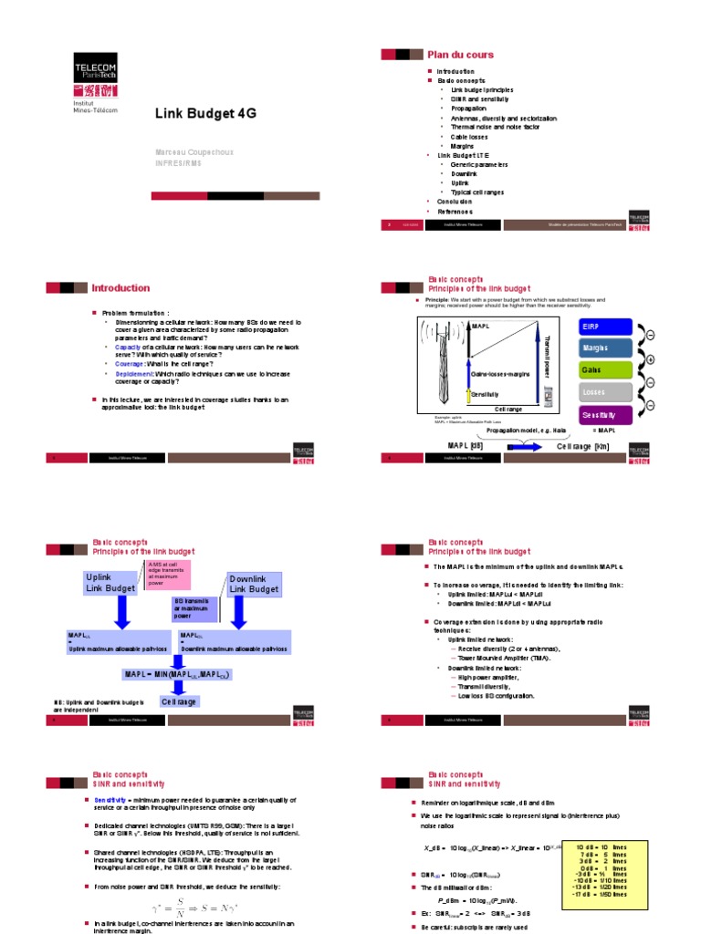 it is needed to identify the limiting link: • Uplink limited: MAPLul < MAPLdl • Downlink limited: MAPLdl < MAPLul BS transmits ar maximum power MAPLUL = Uplink maximum allowable path-loss ! Coverage extension is done by using appropriate radio techniques: • Uplink limited network: ─ Receive diversity (2 or 4 antennas). ! SNRdB = 10 log10(SNRlinear) ! From noise power and SNR threshold. quality of service is not sufficient. we deduce the sensitivity: ! The dB milliwatt or dBm: P_dBm = 10 log10(P_mW). LTE): Throughput is an increasing function of the SNR/SINR. dB and dBm ! We use the logarithmic scale to represent signal to (interference plus) noise ratios ! Dedicated channel technologies (UMTS R99. Downlink Link Budget ! To increase coverage. Below this threshold. ─ Transmit diversity.Basic concepts Principles of the link budget Uplink Link Budget A MS at cell edge transmits at maximum power Basic concepts Principles of the link budget ! The MAPL is the minimum of the uplink and downlink MAPLs. 7 Institut Mines-Télécom ! Be careful: subscripts are rarely used (but it does not mean that 2 = 3 (!)) 8 Institut Mines-Télécom 10 dB = 10 times 7 dB = 5 times 3 dB = 2 times 0 dB = 1 times -3 dB = ½ times -10 dB = 1/10 times -13 dB = 1/20 times -17 dB = 1/50 times . • Downlink limited network: ─ High power amplifier. We deduce from the target throughput at cell edge. MAPLDL = Downlink maximum allowable path-loss MAPL = MIN(MAPLUL. ! Ex: SNRlinear= 2 <=> SNRdB = 3 dB ! In a link budget. ─ Tower Mounted Amplifier (TMA). GSM): There is a target SNR or SINR γ*. the SNR or SINR threshold γ* to be reached.MAPLDL) NB: Uplink and Downlink budgets are independent 5 Cell range Institut Mines-Télécom 6 Basic concepts SINR and sensitivity Institut Mines-Télécom Basic concepts SINR and sensitivity ! Sensitivity = minimum power needed to guarantee a certain quality of service or a certain throughput in presence of noise only ! Reminder on logarithmique scale. ─ Low loss BS configuration. co-channel interferences are taken into account in an interference margin. X_dB = 10 log10(X_linear) => X_linear = 10(X_dB/10) ! Shared channel technologies (HSDPA.