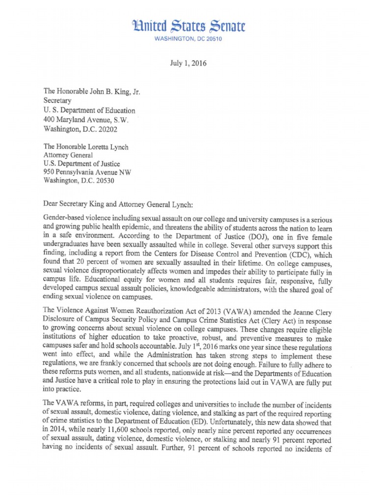 U.S. Senators Tom Udall (D-N.M.) and Martin Heinrich (D-N.M.), along with 29 other senators sent a letter to the Departments of Education and Justice urging the agencies to ensure colleges and universities receiving federal funds adhere to new requirements intended to help prevent sexual violence on campus and increase accountability for students' safety.
