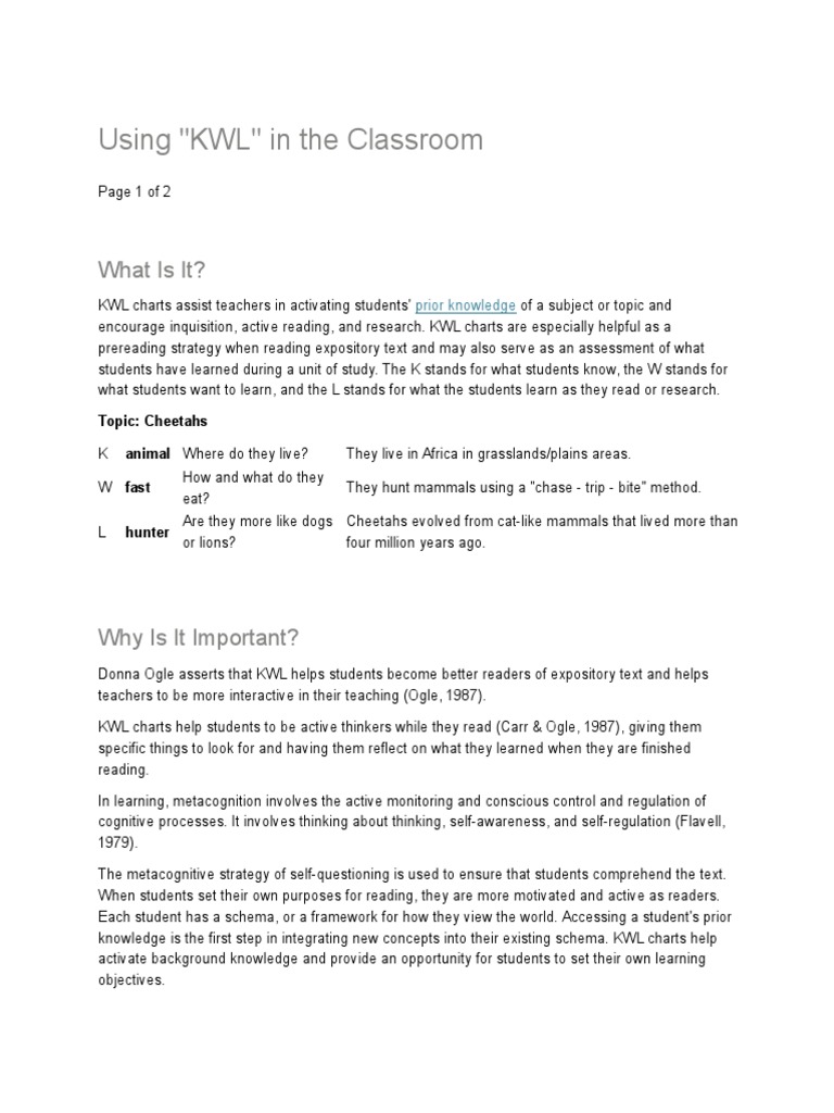 KWL charts help students to be active thinkers while they read (Carr & Ogle, 1987), giving them