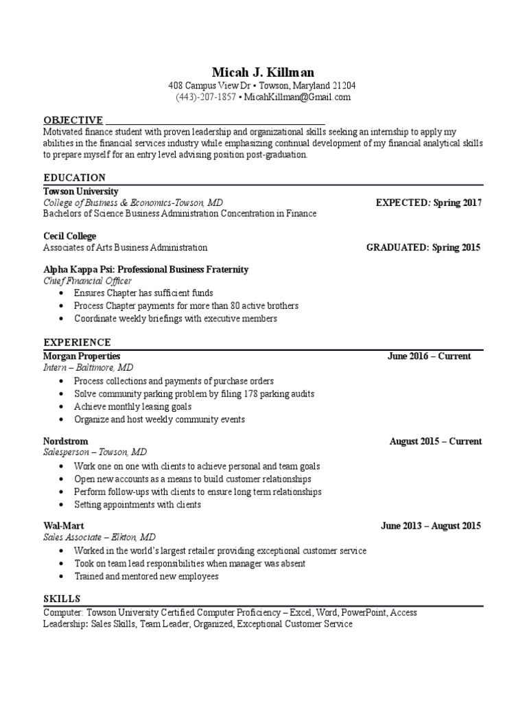 Motivated finance student with proven leadership and organizational skills seeking an internship to apply my