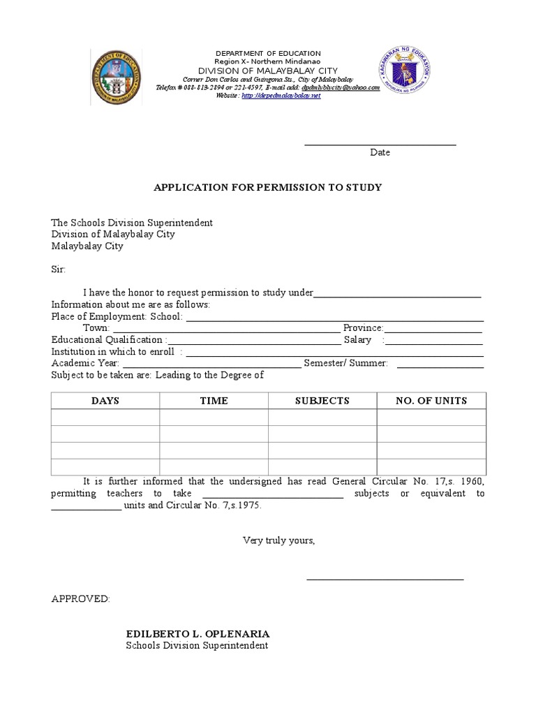APPLICATION FOR PERMISSION TO STUDY