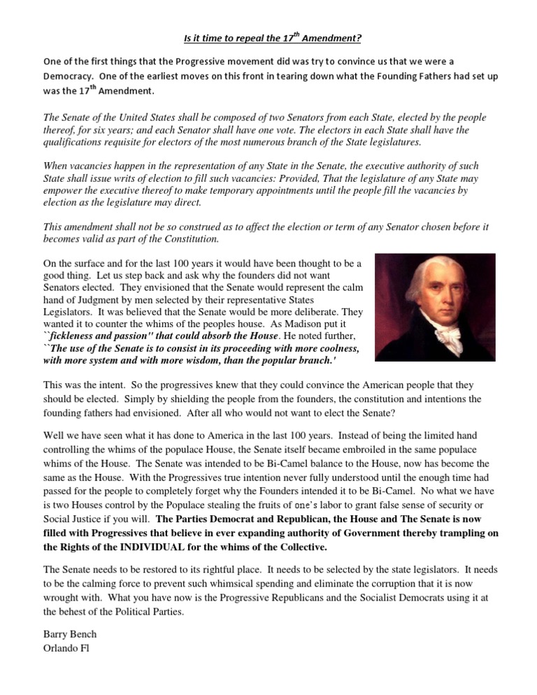 The Senate needs to be restored to its rightful place. It needs to be selected by the state legislators. It needs