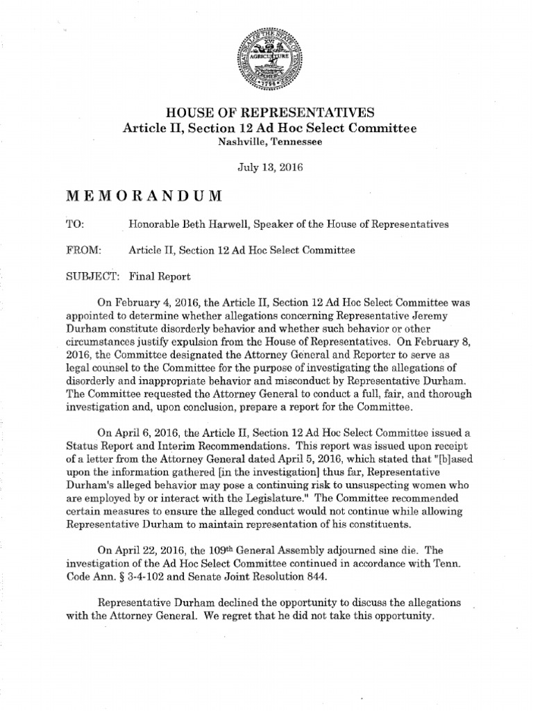 Final report from House of Representatives concludes that Rep. Jeremy Durham (R-Franklin) engaged in inappropriate conduct that was “far from what is expected of a House member.”