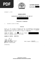 Autopsy Report: Details the findings from the autopsy including observations of gunshot wounds and abrasion.