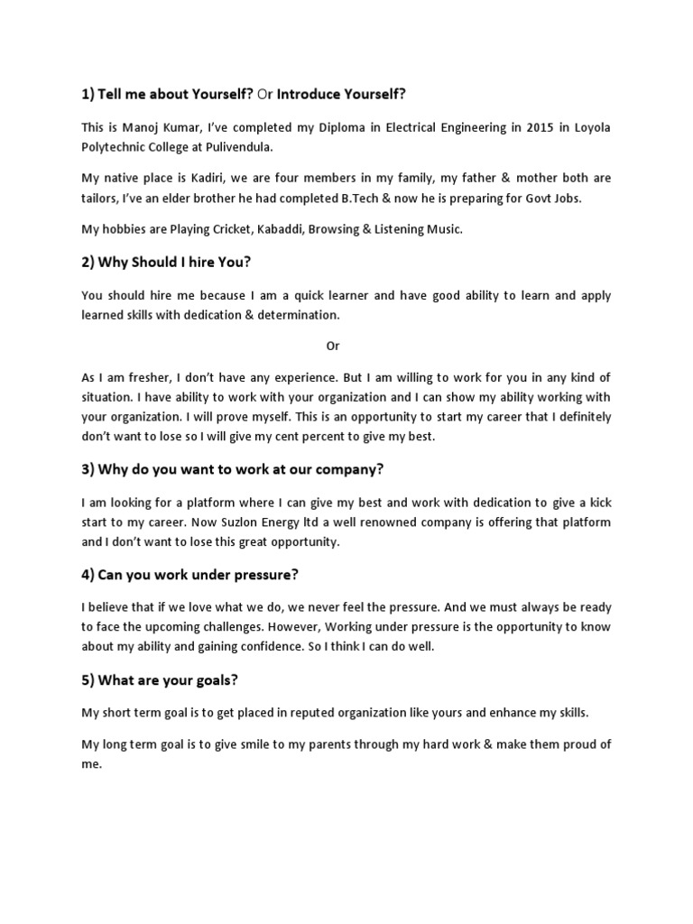 1) Tell me about Yourself? Or Introduce Yourself?
