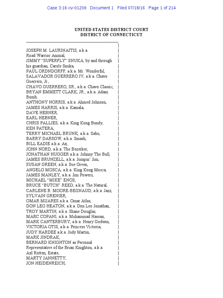 __________________________________________ | JOSEPH M. LAURINAITIS, a.k.a. | Road Warrior Animal, | JIMMY “SUPERFLY” SNUKA, by and through | his guardian, Carole Snuka, | PAUL ORDNDORFF, a.k.a. Mr. Wonderful, | SALAVADOR GUERRERO IV, a.k.a. Chavo | Guerrero, Jr., | CHAVO GUERRERO, SR., a.k.a. Chavo Classic, | BRYAN EMMETT CLARK, JR., a.k.a. Adam | Bomb, | ANTHONY NORRIS, a.k.a. Ahmed Johnson, | JAMES HARRIS, a.k.a. Kamala, | DAVE HEBNER, | EARL HEBNER, | CHRIS PALLIES, a.k.a. King Kong Bundy, | KEN PATERA, | TERRY MICHAEL BRUNK, a.k.a. Sabu, | BARRY DARSOW, a.k.a. Smash, | BILL EADIE a.k.a. Ax, | JOHN NORD, a.k.a. The Bezerker, | JONATHAN HUGGER a.k.a. Johnny The Bull, | JAMES BRUNZELL, a.k.a. Jumpin’ Jim, | SUSAN GREEN, a.k.a. Sue Green, | ANGELO MOSCA, a.k.a. King Kong Mosca, | JAMES MANLEY, a.k.a. Jim Powers, | MICHAEL “MIKE” ENOS, | BRUCE “BUTCH” REED, a.k.a. The Natural, | CARLENE B. MOORE-BEGNAUD, a.k.a. Jazz, | SYLVAIN GRENIER, | OMAR MIJARES a.k.a. Omar Atlas, | DON LEO HEATON, a.k.a. Don Leo Jonathan, | TROY MARTIN, a.k.a. Shane Douglas, | MARC COPANI, a.k.a. Muhammad Hassan, | MARK CANTERBURY, a.k.a. Henry Godwin, | VICTORIA OTIS, a.k.a. Princess Victoria, | JUDY HARDEE a.k.a. Judy Martin, | MARK JINDRAK, | BERNARD KNIGHTON as Personal | Representative of the Brian Knighton, a.k.a. | Axl Rotten, Estate, | MARTY JANNETTY, | JON HEIDENREICH, |