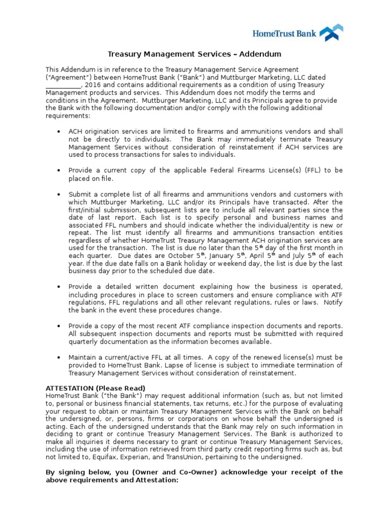 This Addendum is in reference to the Treasury Management Service Agreement (“Agreement”) between HomeTrust Bank (“Bank”) and Muttburger Marketing !!" dated ########### $%&' and contains additiona reuirements as a condition of using Treasury Management *roducts and services+ This Addendum does not modify the terms and conditions in the Agreement+ Muttburger Marketing !!" and its ,rinci*as agree to *rovide the Bank with the foowing documentation and-or com*y with the foowing additiona reuirements.