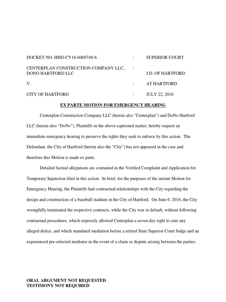 Centerplan Request for Emergency Hearing