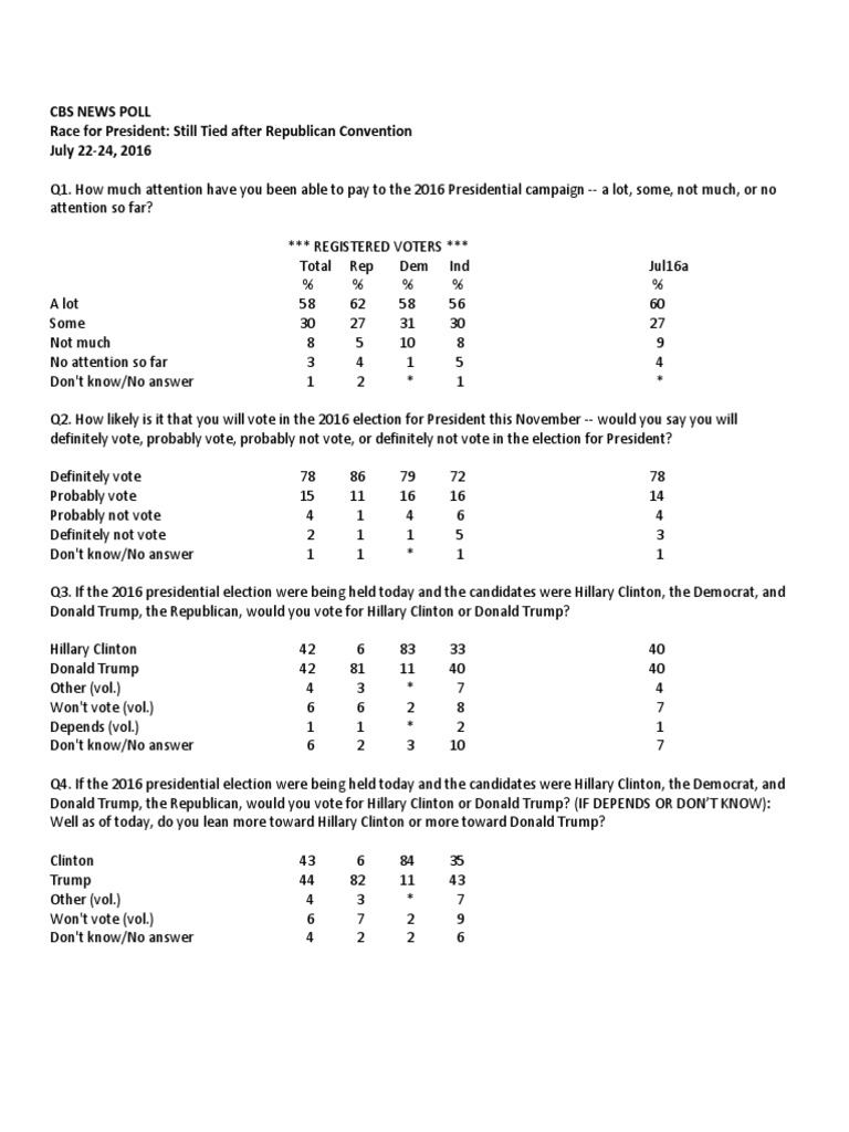 Well as of today, do you lean more toward Hillary Clinton, or more toward Donald Trump, or more towards Gary Johnson? Clinton 39 6 79 31 Trump 40 81 10 37 Johnson 12 9 8 18 Other (vol.) 2 2 * 3 Won't vote (vol.) 3 2 1 5 Don't know/No answer 4 2 2 6 Q7. You told us you support Hillary Clinton over Donald Trump. Is your mind made up or do you think you might change your mind before the election? *** CLINTON VOTERS *** Jul16a % %