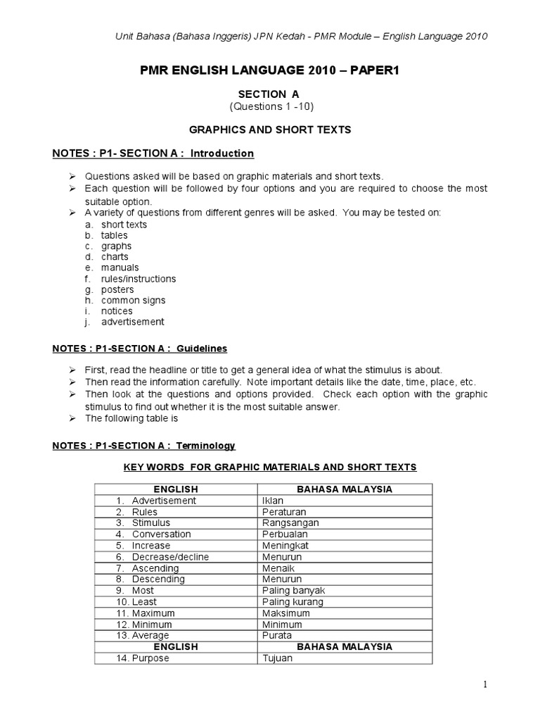 Unit Bahasa (Bahasa Inggeris) JPN Kedah - PMR Module English Language 2010