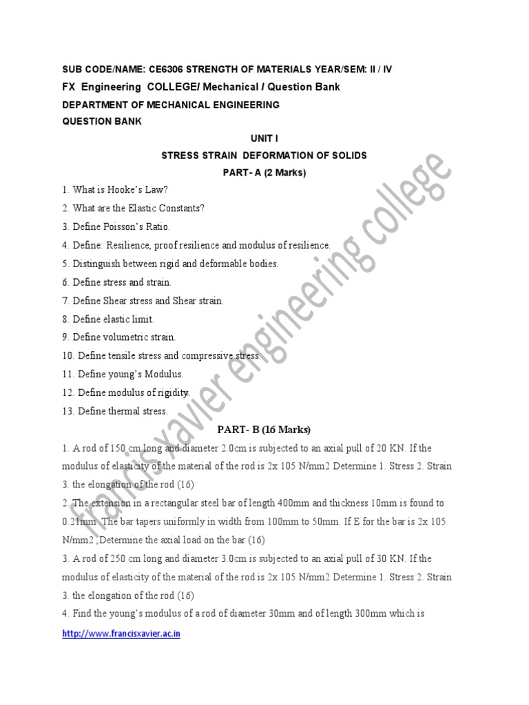 SUB CODE/NAME: CE6306 STRENGTH OF MATERIALS YEAR/SEM: II / IV