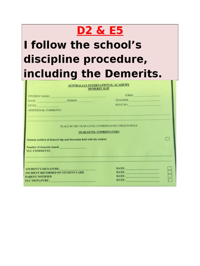 The document discusses following a school's discipline procedure, including issuing Demerits. It refers to sections D2 and E5 of the procedure and notes compliance with issuing consequences.