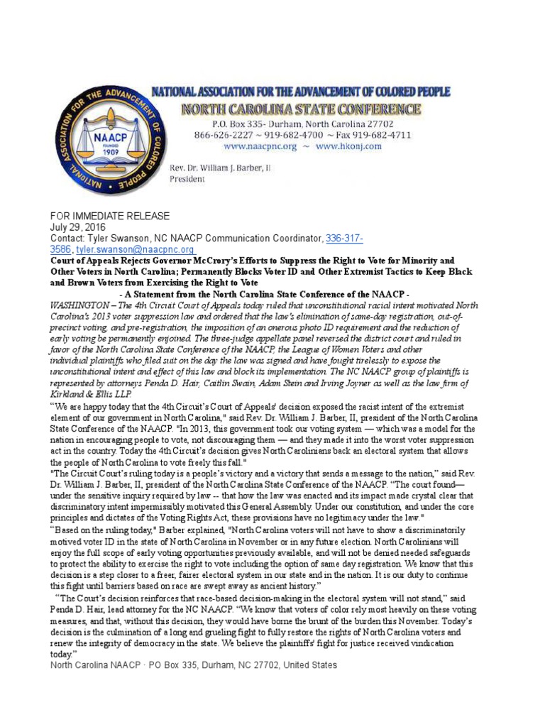 072916 NC NAACP - 4th Circuit Voter ID Statement