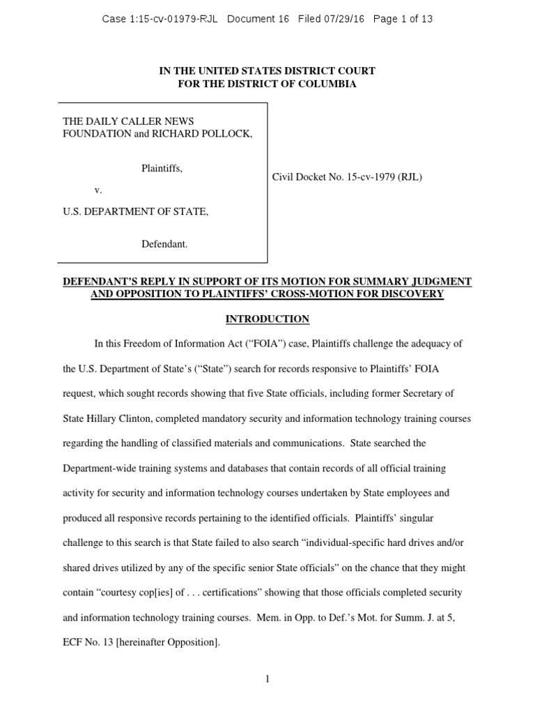 THE DAILY CALLER NEWS FOUNDATION and RICHARD POLLOCK, Plaintiffs, v. U.S. DEPARTMENT OF STATE, Defendant. Civil Docket No. 15-cv-1979 (RJL)