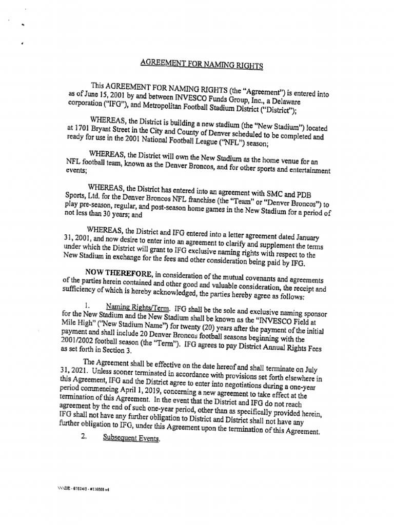 Mile High Stadium Naming Rights Agreement