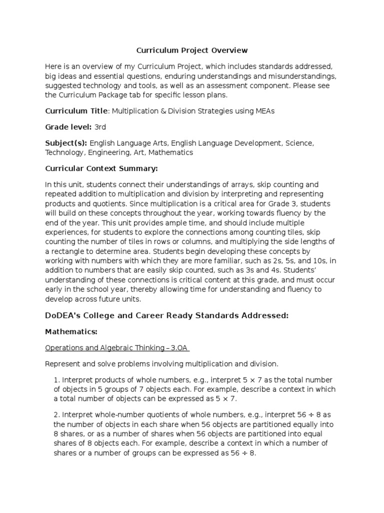 Here is an overview of my Curriculum Project, which includes standards addressed,