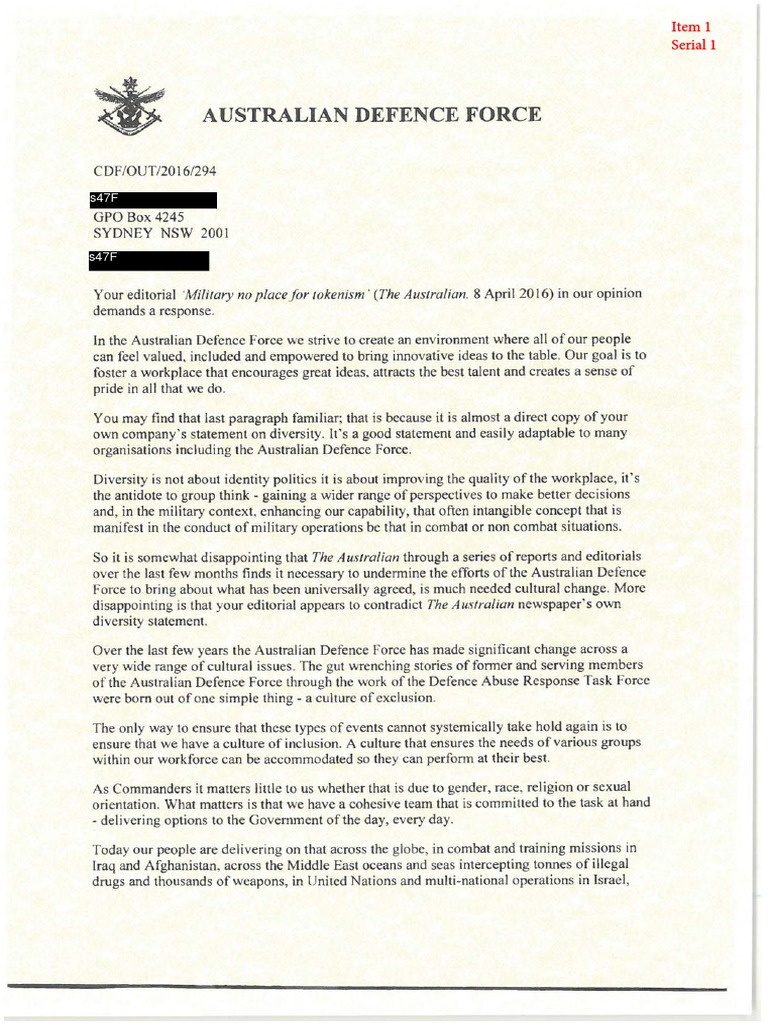 Attachments: LETTER - 160411 - CDF - Response to Editor ref article 'Military no place for tokenism' The