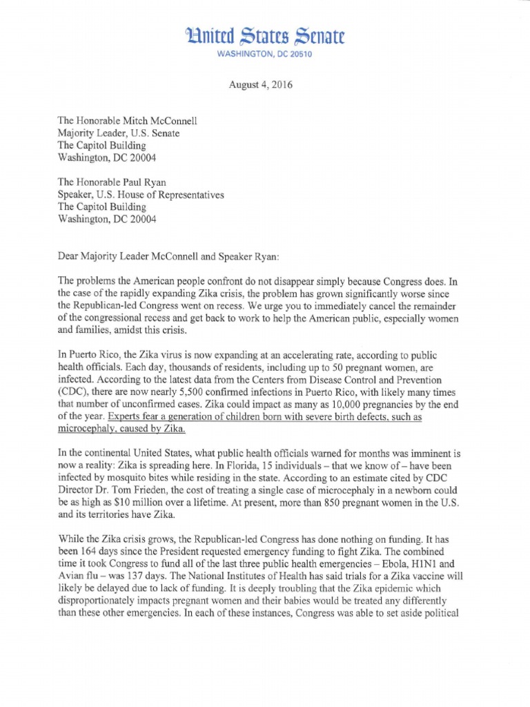 WASHINGTON - As more Americans contract the Zika virus, U.S. Senators Tom Udall (D-N.M.) and Martin Heinrich (D-N.M.) sent a letter to Senate Majority Leader Mitch McConnell and House Speaker Paul Ryan urging the Republican leaders to immediately call Congress back into session to pass emergency funding legislation to address the growing Zika crisis.