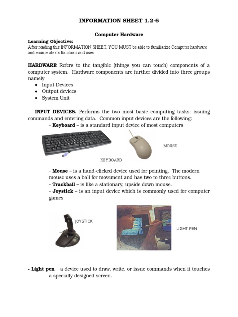 After reading this INFORMATION SHEET, YOU MUST be able to familiarize Computer hardware