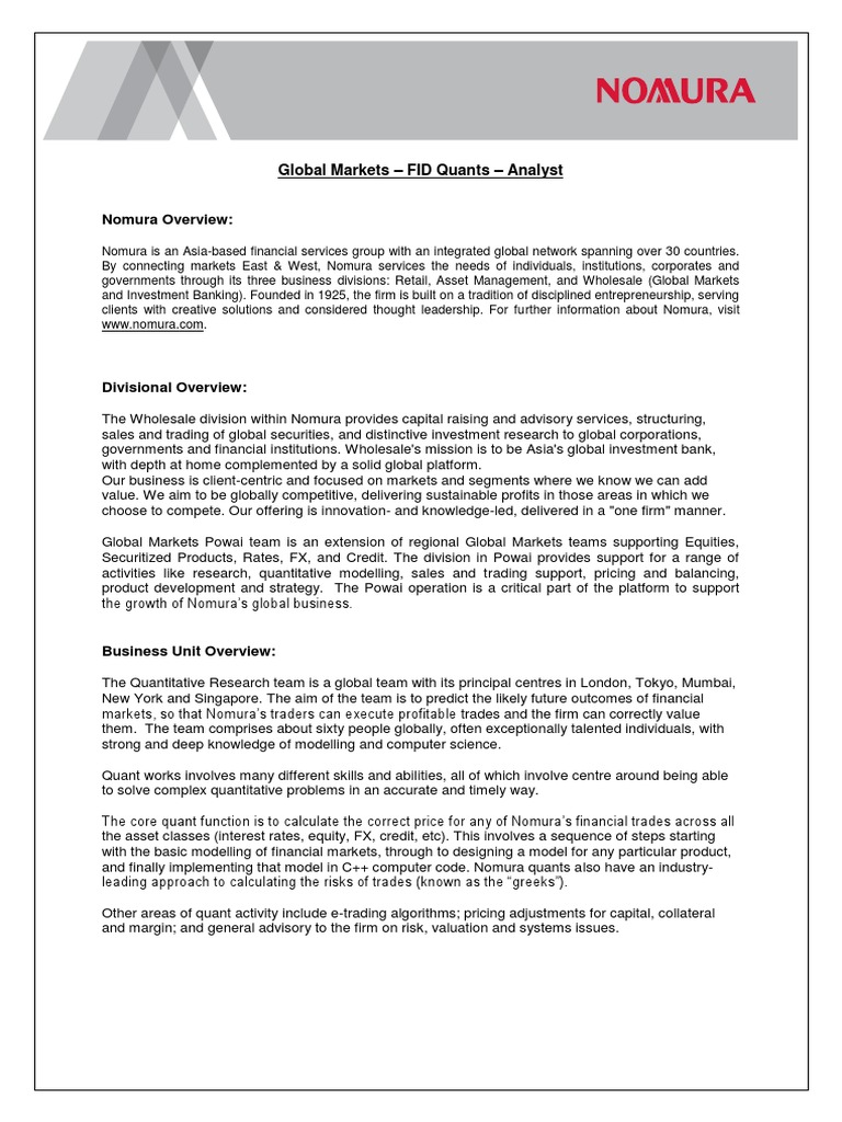 and finally implementing that model in C++ computer code. Nomura quants also have an industryleading approach to calculating the risks of trades (known as the greeks).