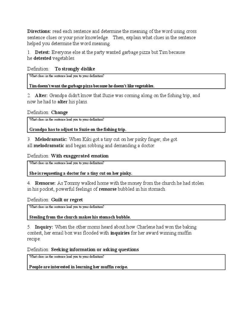 clues or your prior knowledge. Then, explain what clues in the sentence helped you determine