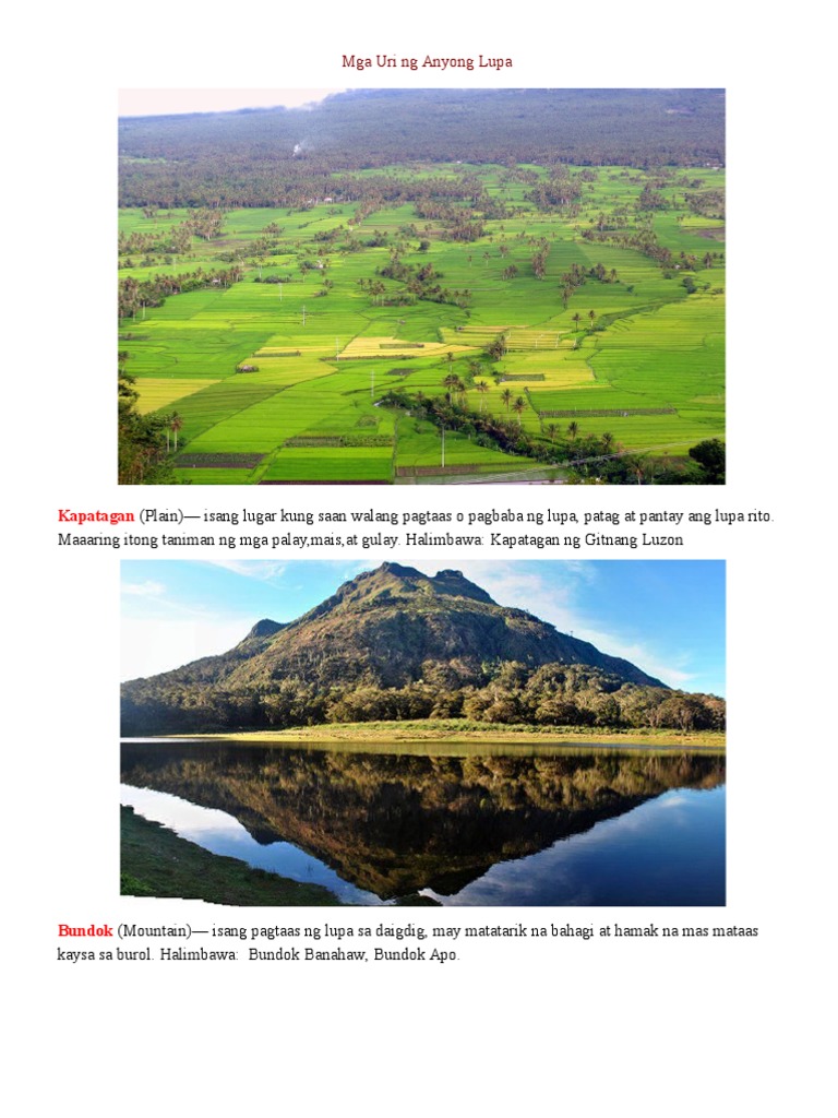Burol (Hill) higit na mas mababa ito kaysa sa bundok. Pabilog ang hugis nito at tinutubuan ng mga luntiang