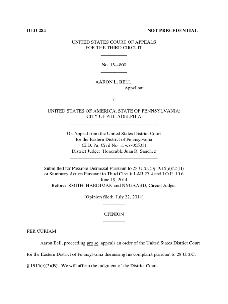 UNITED STATES COURT OF APPEALS FOR THE THIRD CIRCUIT ___________ No. 13-4800 ___________ AARON L. BELL, Appellant v. UNITED STATES OF AMERICA; STATE OF PENNSYLVANIA; CITY OF PHILADELPHIA ____________________________________ On Appeal from the United States District Court for the Eastern District of Pennsylvania (E.D. Pa. Civil No. 13-cv-05533) District Judge: Honorable Juan R. Sanchez ____________________________________ Submitted for Possible Dismissal Pursuant to 28 U.S.C. § 1915(e)(2)(B) or Summary Action Pursuant to Third Circuit LAR 27.4 and I.O.P. 10.6 June 19, 2014 Before: SMITH, HARDIMAN and NYGAARD, Circuit Judges (Opinion filed: July 22, 2014) _________ OPINION _________ PER CURIAM Aaron Bell, proceeding pro se, appeals an order of the United States District Court for the Eastern District of Pennsylvania dismissing his complaint pursuant to 28 U.S.C. § 1915(e)(2)(B). We will affirm the judgment of the District Court.