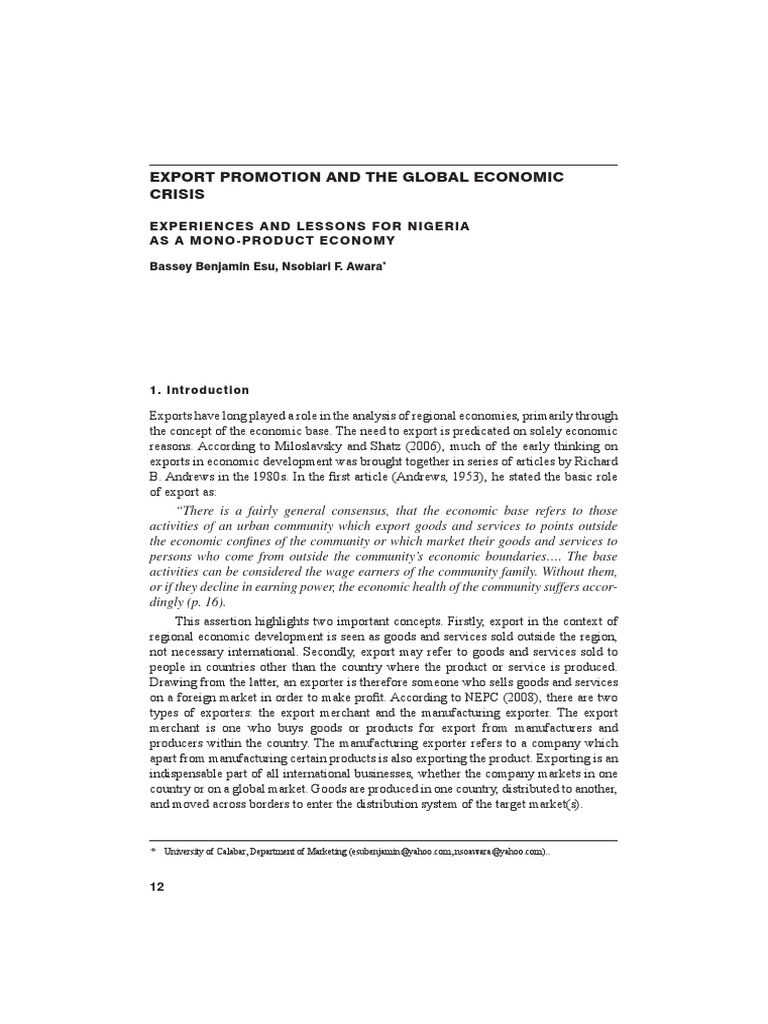 Abstract: The importance of export promotion and marketing cannot be overemphasized. This is because of the attendant economic flow into the home country. Because of