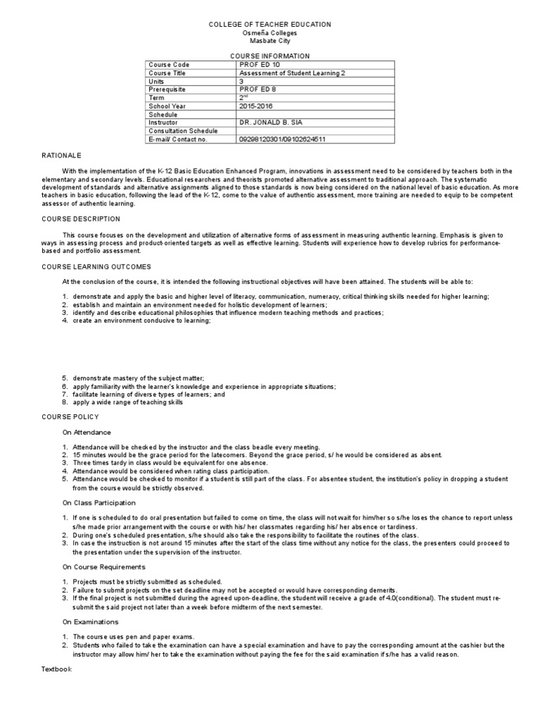ways in assessing process and product-oriented targets as well as effective learning. Students will experience how to develop rubrics for performancebased and portfolio assessment.