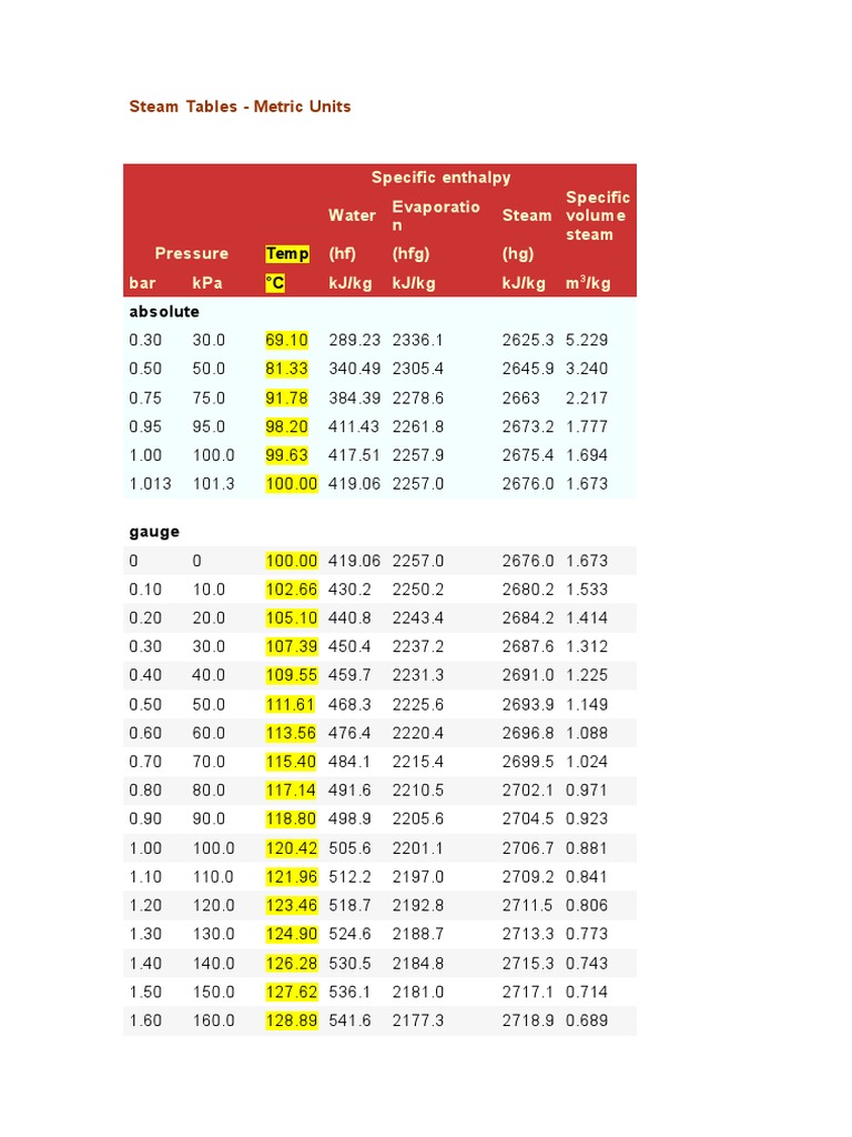 Steam Tables - Metric Units