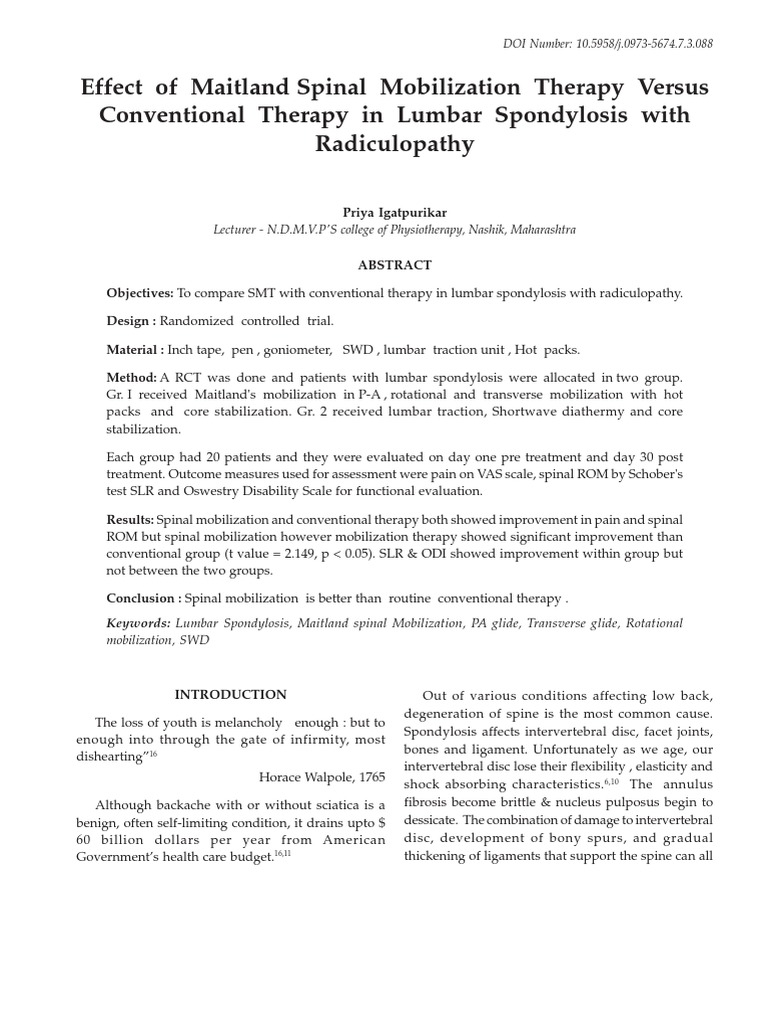 Effect of Maitland Spinal Mobilization Therapy Versus
