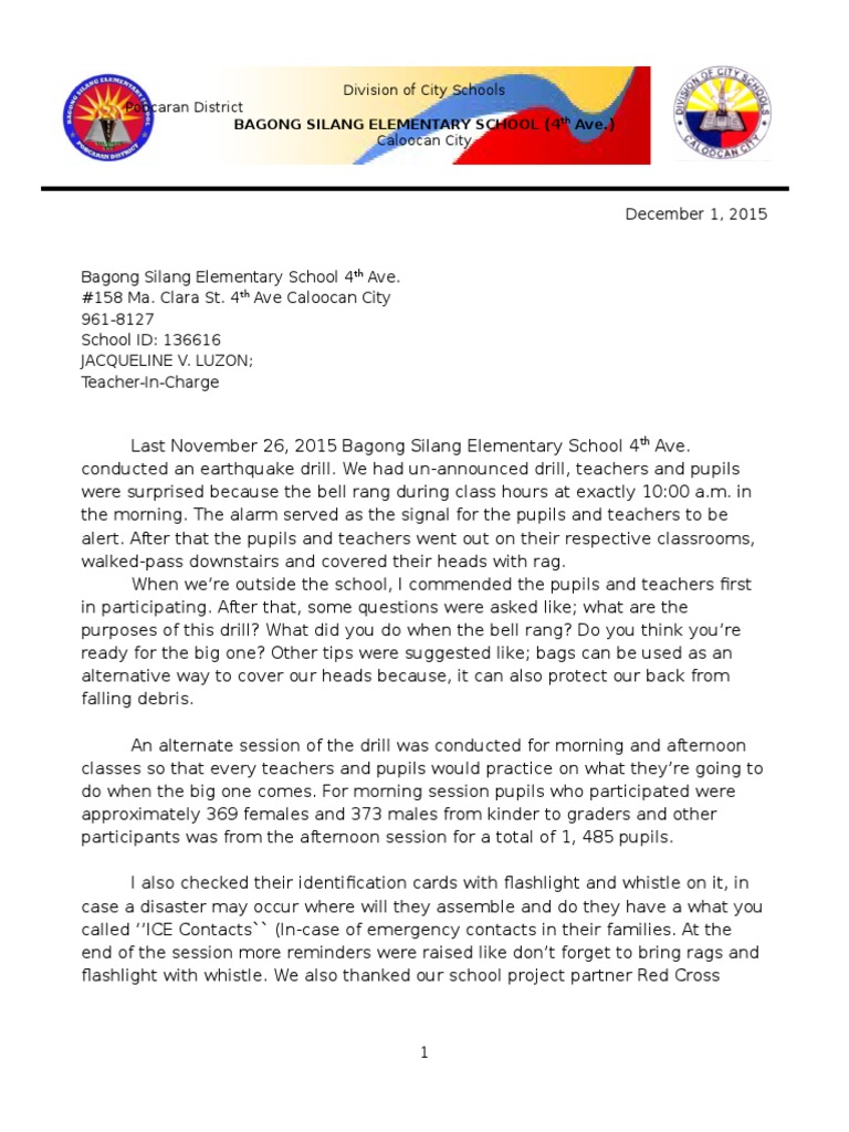 Last November 26, 2015 Bagong Silang Elementary School 4th Ave.