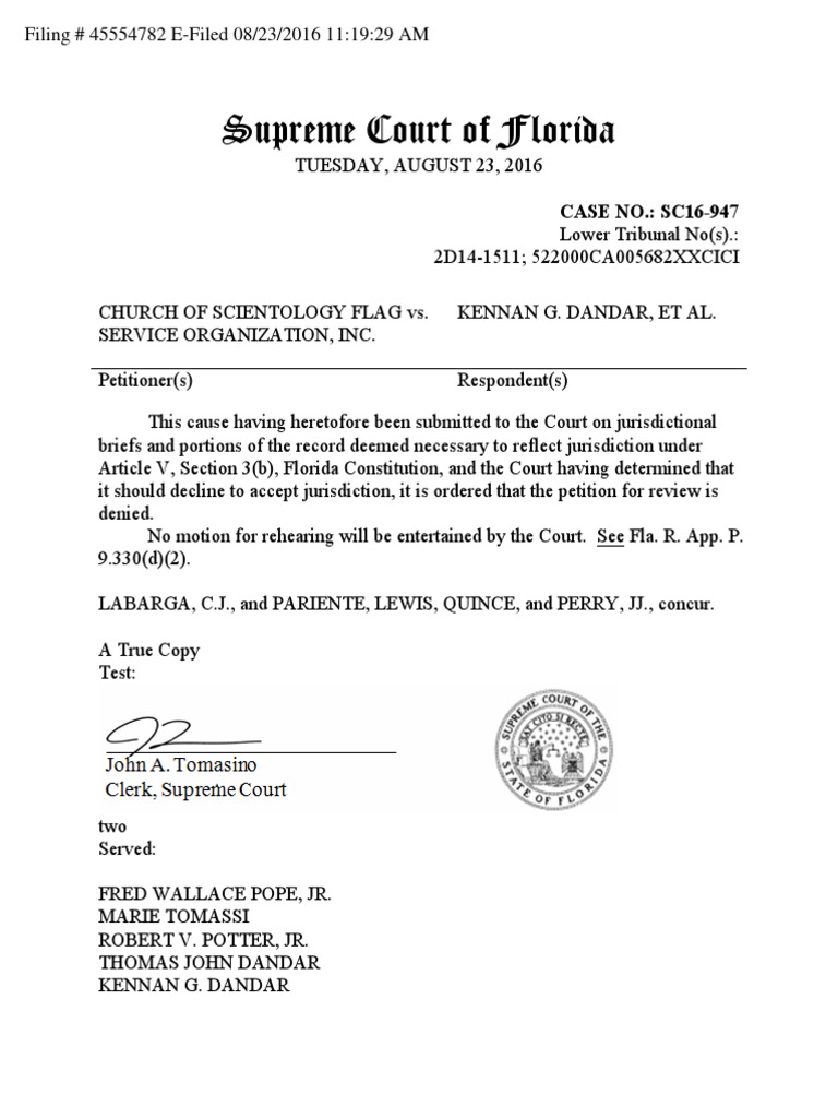 Lower Tribunal No(s).:2D14-1511; 522000CA005682XXCICICHURCH OF SCIENTOLOGY FLAG SERVICE ORGANIZATION, INC.vs.KENNAN G. DANDAR, ET AL.Petitioner(s)Respondent(s)This cause having heretofore been submitted to the Court on jurisdictional briefs and portions of the record deemed necessary to reflect jurisdiction under Article V, Section 3(b), Florida Constitution, and the Court having determined that it should decline to accept jurisdiction, it is ordered that the petition for review is denied. No motion for rehearing will be entertained by the Court. See Fla. R. App. P. 9.330(d)(2).LABARGA, C.J., and PARIENTE, LEWIS, QUINCE, and PERRY, JJ., concur.A True CopyTest:twoServed:FRED WALLACE POPE, JR.MARIE TOMASSIROBERT V. POTTER, JR.THOMAS JOHN DANDAR KENNAN G. DANDAR