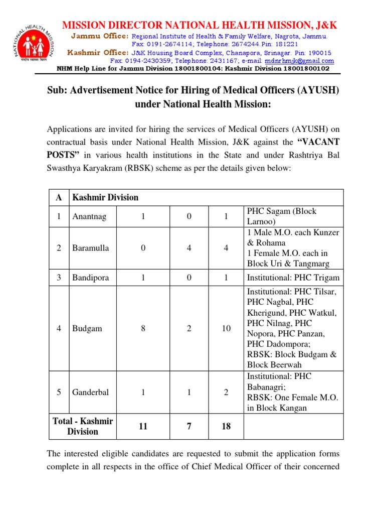 NHM Help Line for Jammu Division 18001800104: Kashmir Division 18001800102
