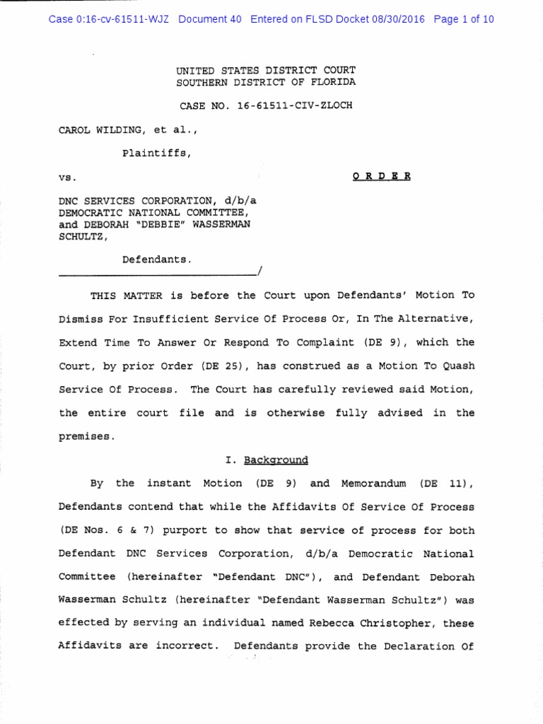 no authority to accept service on behalf of either Defendant.The Court notes for the record that, at the Hearing, the Courtasked Plaintiffs to clarify whether Defendant Wasserman Schultz isbeing sued in her corporate or her individual capacity. Plaintiffsconfirmed that she is being sued in her individual capacity.