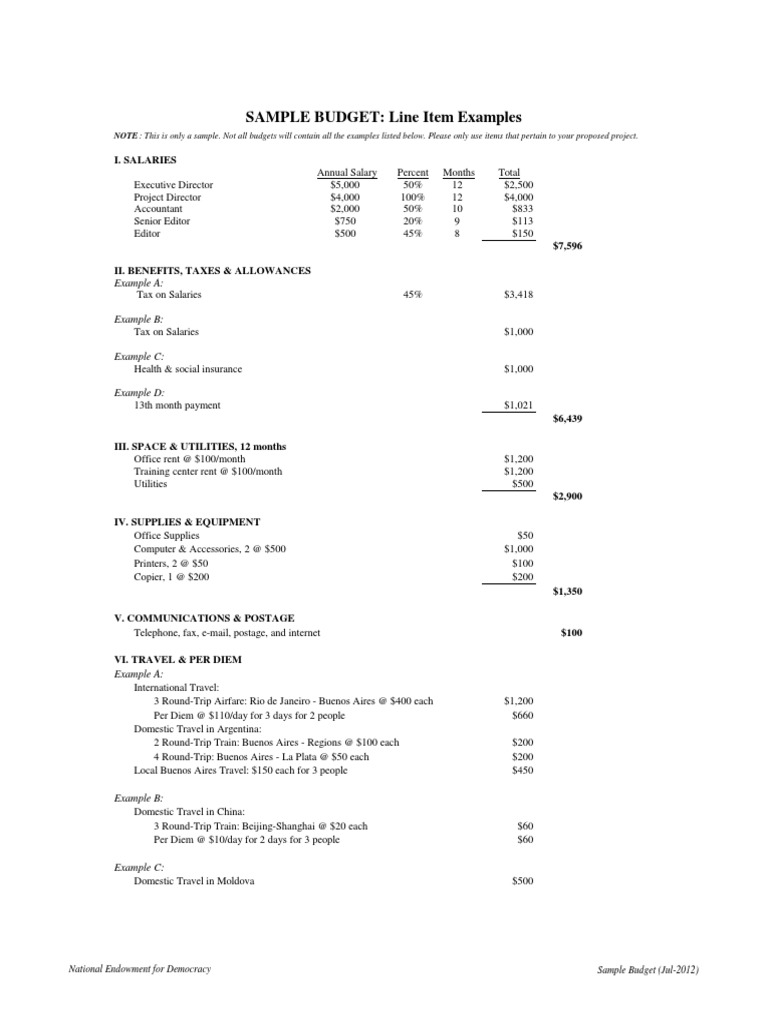NOTE : This is only a sample. Not all budgets will contain all the examples listed below. Please only use items that pertain to your proposed project.