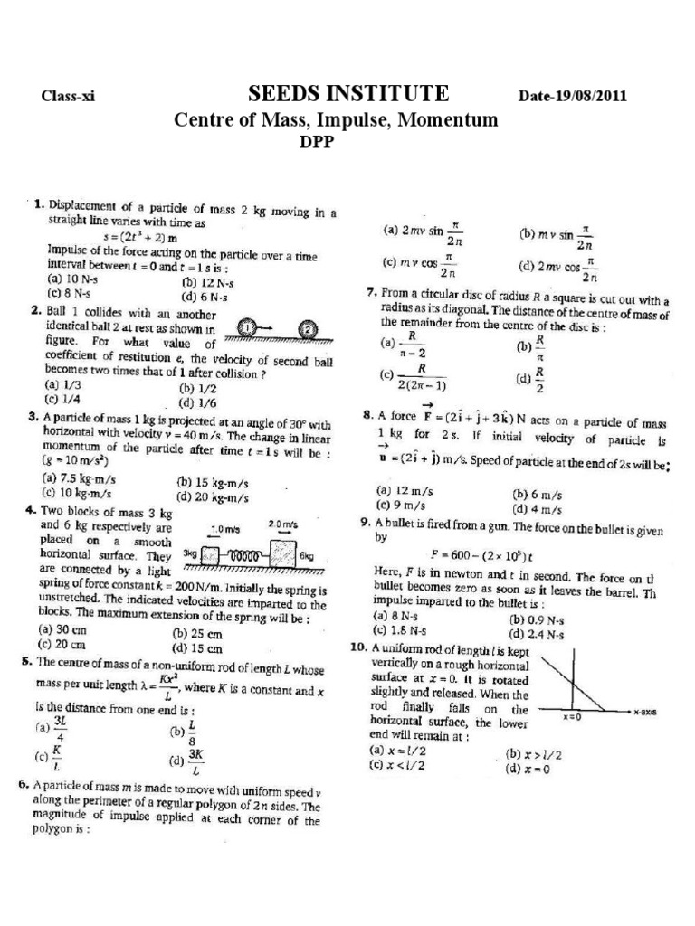 Seeds Institute held a class for 11th grade students on August 19th, 2011 about the topics of center of mass, impulse, and momentum. The class covered these physics concepts as part of the students' DPP, or daily physics practice.