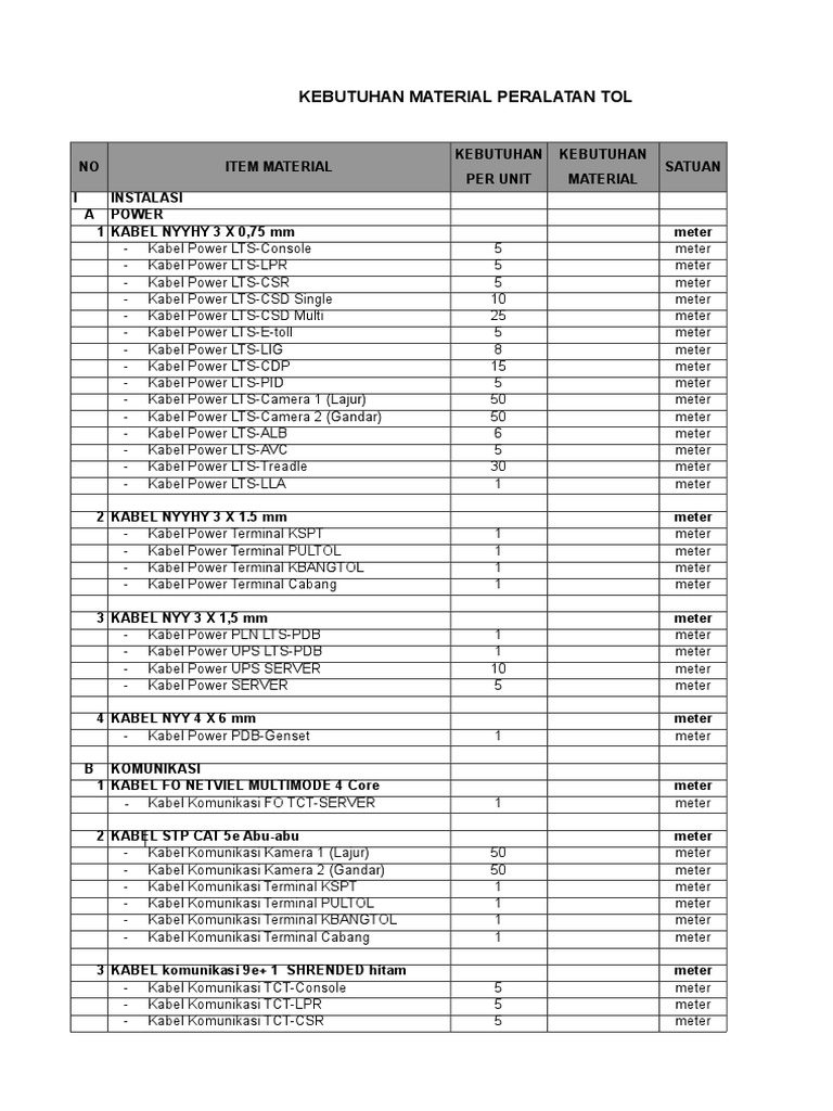 Material List for Toll Installation