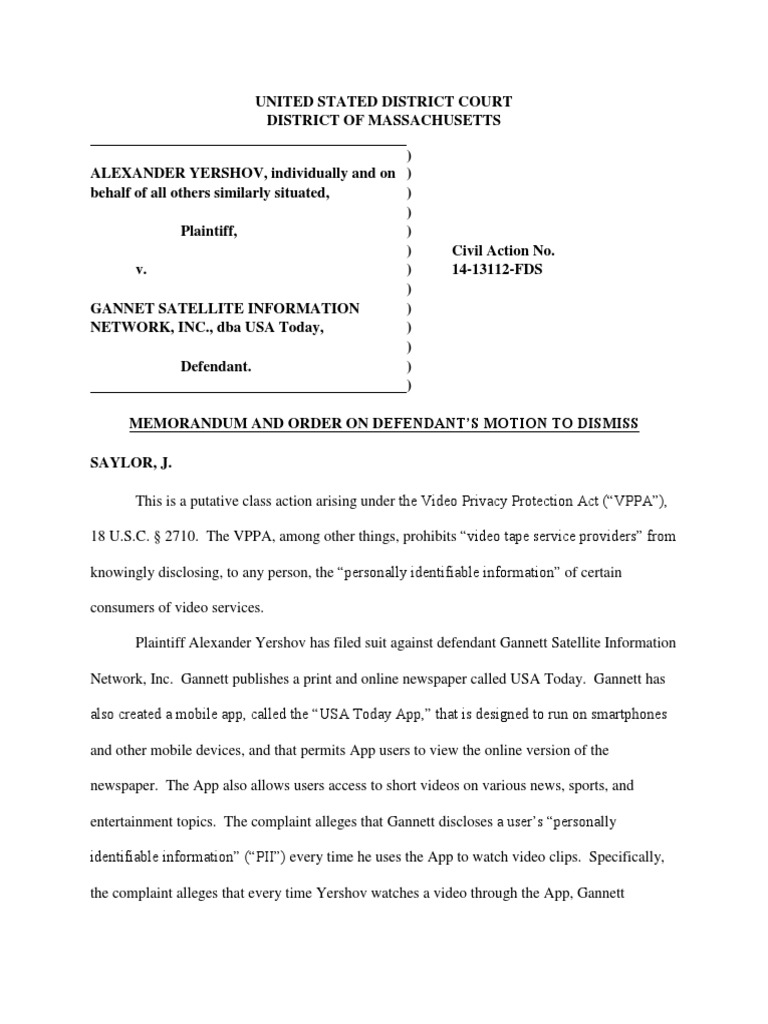 this Court. See Yershov v. Gannett Satellite Info. Network, Inc., 104 F. Supp. 3d 135, 137-38 (D.