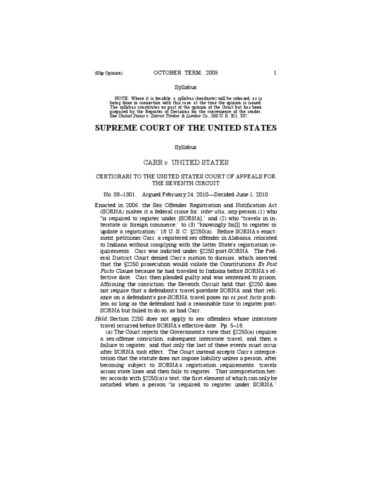 any person (1) who“is required to register under [SORNA],” and (2) who “travels in in-terstate or foreign commerce,” to (3) “knowingly fai[l] to register orupdate a registration,” 18 U. S. C. §2250(a). Before SORNA’s enact-ment, petitioner Carr, a registered sex offender in Alabama, relocatedto Indiana without complying with the latter State’s registration re-quirements. Carr was indicted under §2250 post-SORNA. The Fed-eral District Court denied Carr’s motion to dismiss, which asserted that the §2250 prosecution would violate the Constitution’s