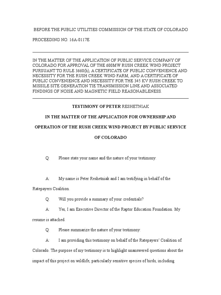 Testimony of Peter Reshetniak On Behalf of The Ratepayers' Coalition Concerning The Rush Creek Wind Project