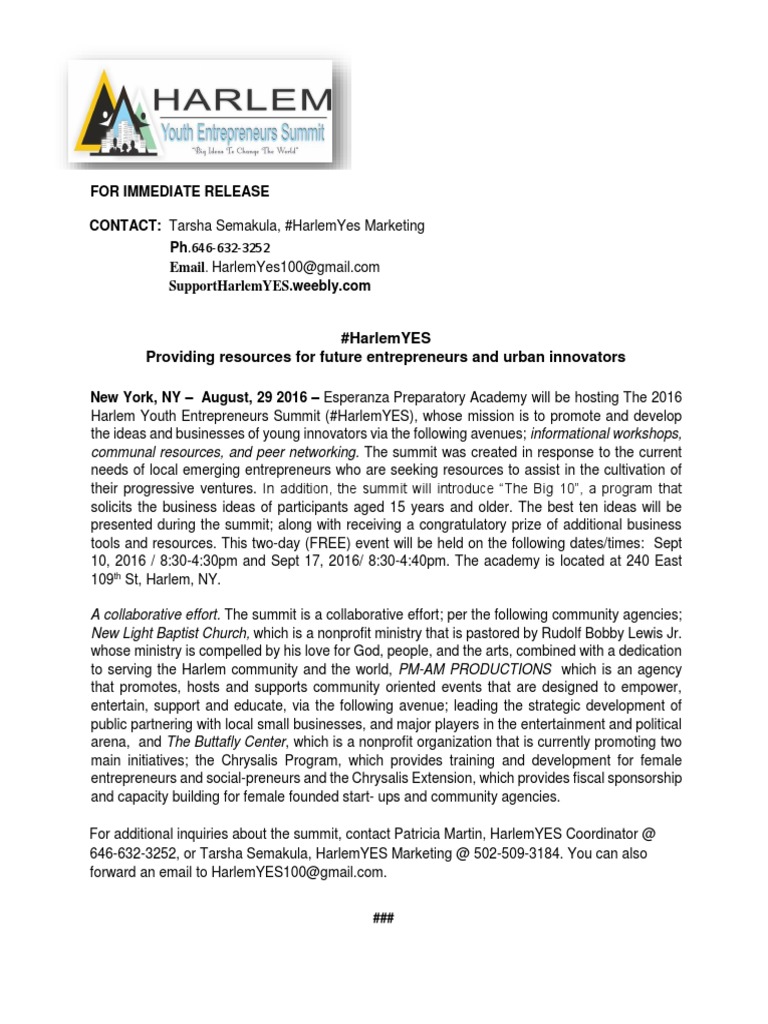 Harlem Youth Entrepreneurs Summit (#HarlemYES), whose mission is to promote and develop