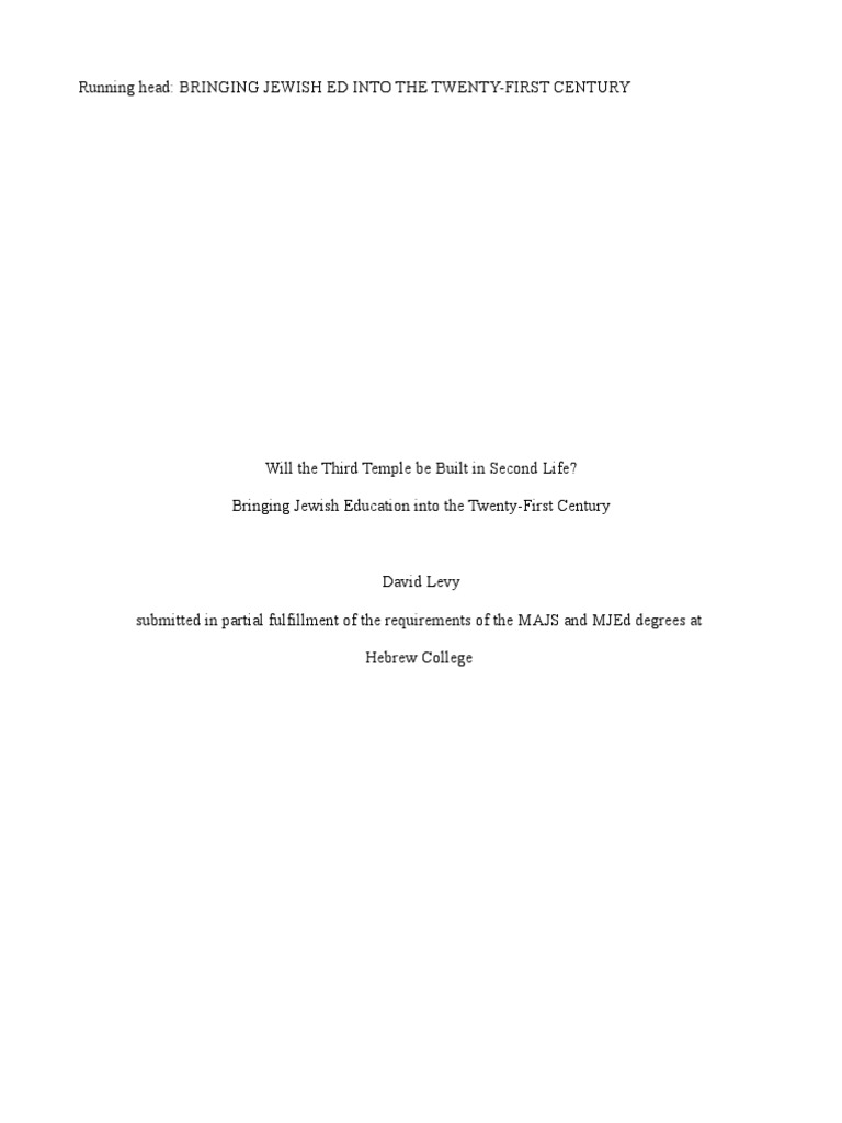 Will The Third Temple Be Built in Second Life? Bringing Jewish Education Into The Twenty-First Century