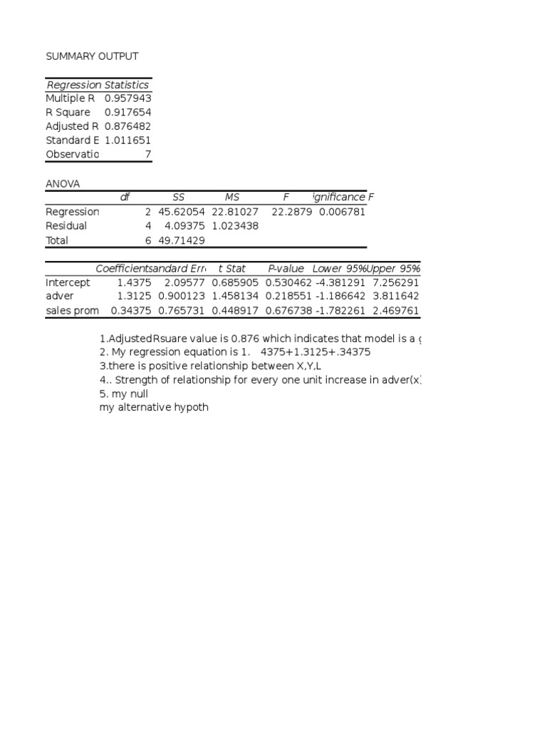 n adver(x) y will increase by 1.3125 and for everyone unit increase in sales pro(l) y will increase by .34325