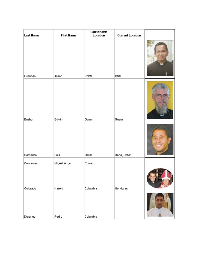 The document lists individuals with their last names, first names, last known locations, and current locations. Some individuals have missing current location information. The locations mentioned include CNMI, Guam, Qatar, Rome, Honduras, Japan, San Francisco, and New York.