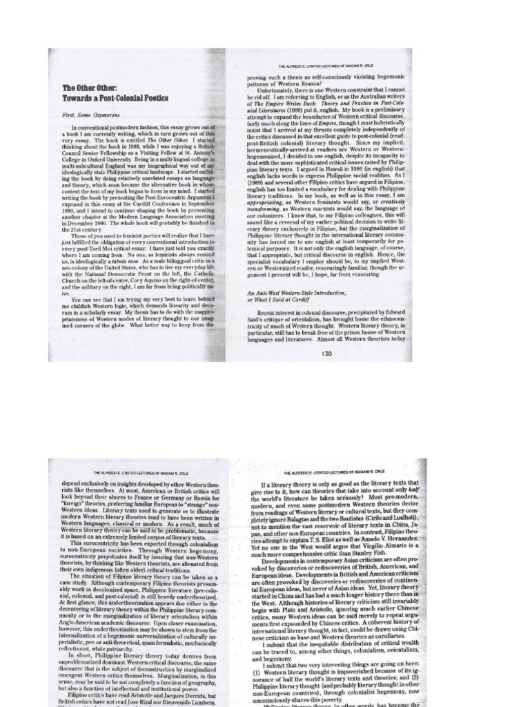 In his article, Isagani Cruz criticized the use of criticism by Filipinos which are patterned after Western theorists. According to Cruz, “Philippine literature is still heavily untheorized.” That is, Philippine literature is still muted in the world of literary theories. Cruz provided us the possible reasons which are either “the decentering of literary theory within the Philippine literary community or the marginalization of Literary Orientalism within Anglo-American academic discourse.”