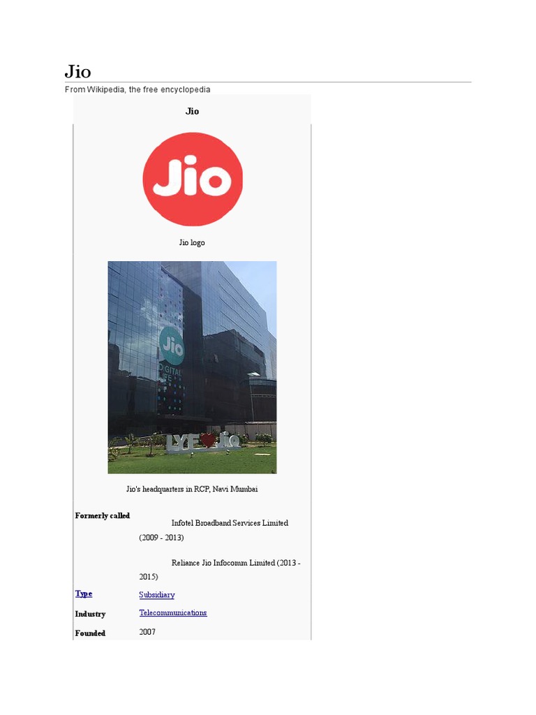 services in India. Formerly known as Infotel Broadband Services Limited, Jio provides 4G