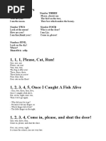 This short poem uses numbers from one to four to describe simple scenes. For one, a cat is asked to please run. For two, a dog is after something. Three birds sit in a tree. Four cats rest on the floor.