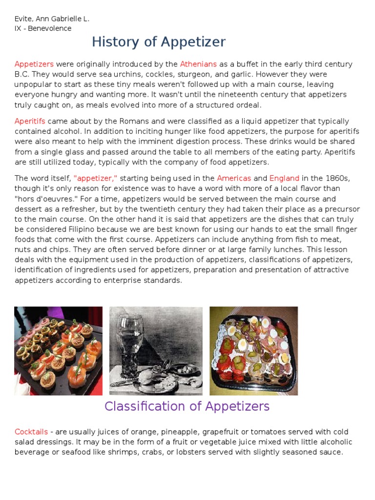 identification of ingredients used for appetizers, preparation and presentation of attractive